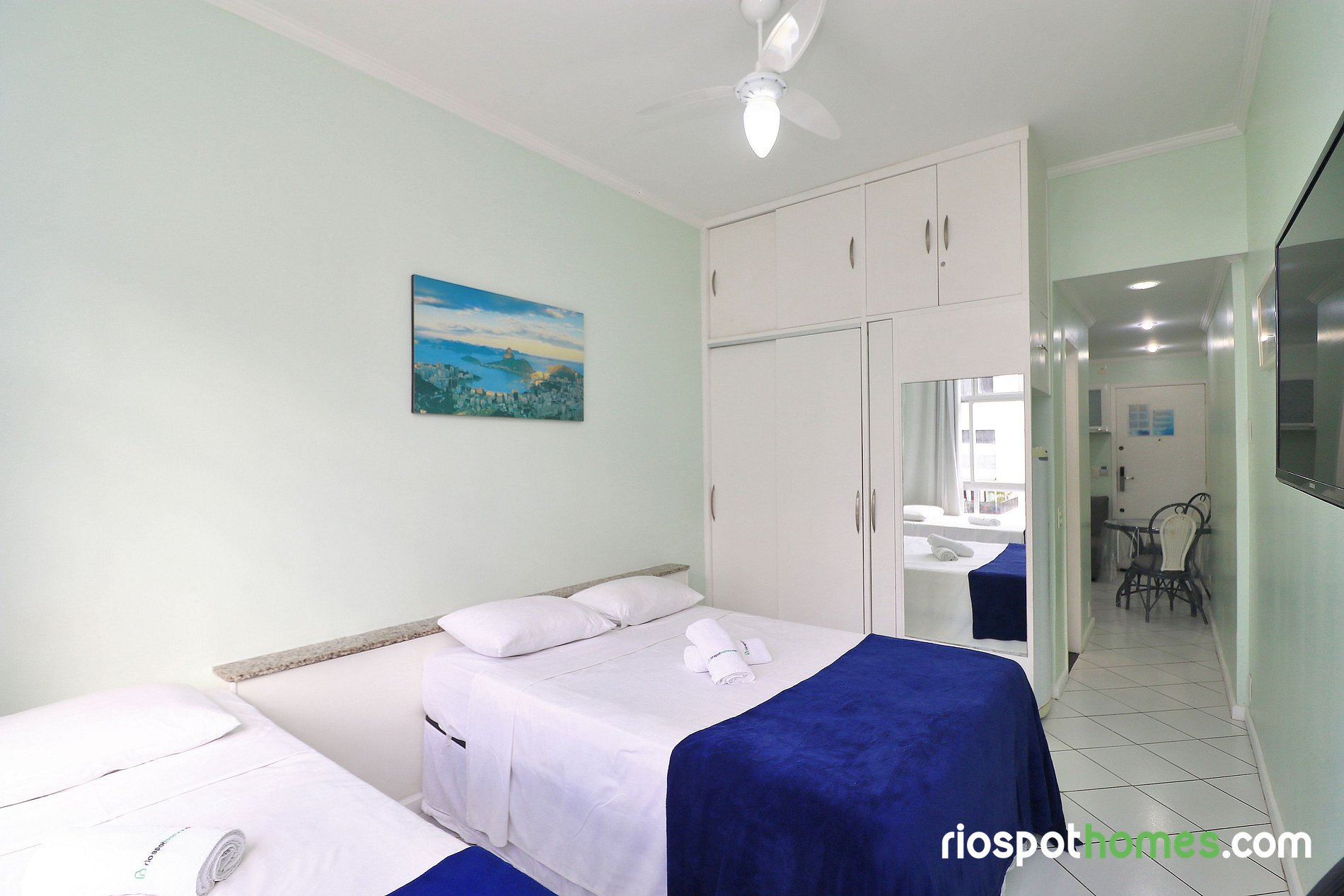 This incredible apartment is located on the block of Copacabana beach with a privileged view to the most famous beach in the world. This includes a comfortable double bed, a single bed, 1 double sofa-bed, air conditioning, 1 ceiling fan, 1 bathroom with large box, full kitchen with all the electros and utensils, cable TV and Wi-fi Internet.