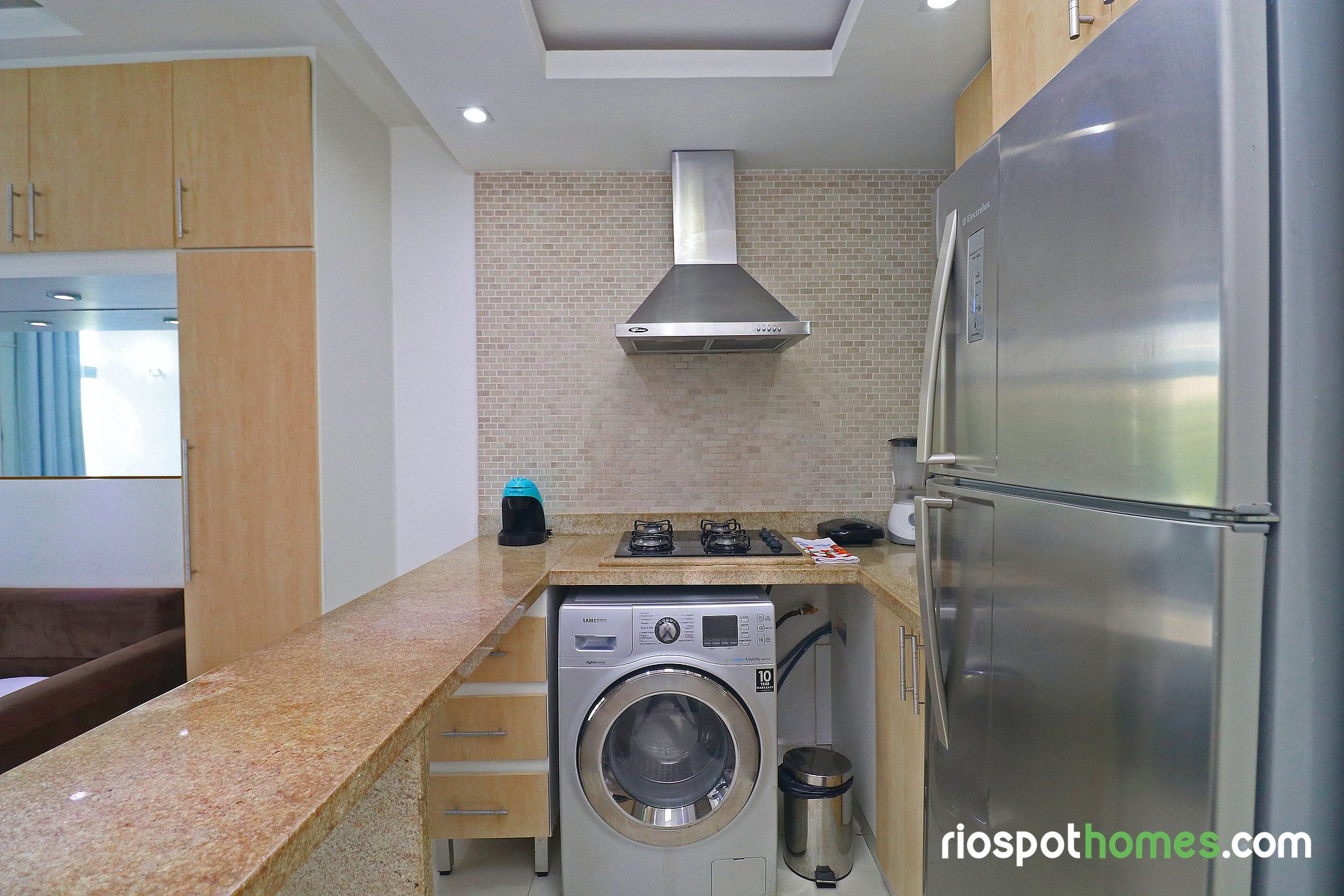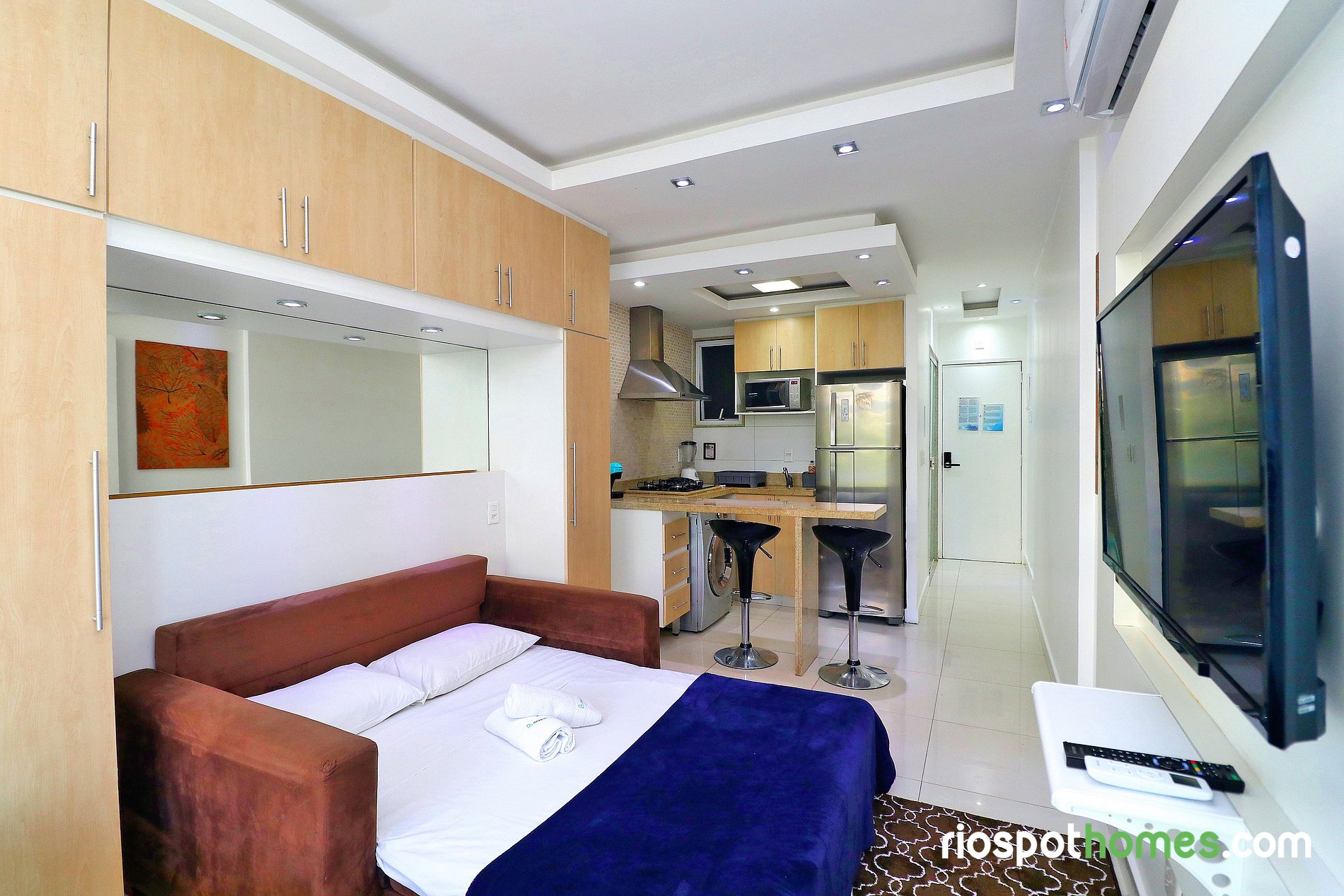 Este hermoso apartamento para temporada tiene un área total de 28 m² y está dividido en habitación, cocina americana y baño. La habitación acogedora cuenta con una cama doble, sofá cama, TV LCD, aire acondicionado SPLIT, ventilador de techo y un guardarropa incorporado. La cocina equipada con utensilios básicos, dispone de una lavadora y secadora, nevera, microondas, cocina de cocina de 4 bocas y cafetera.