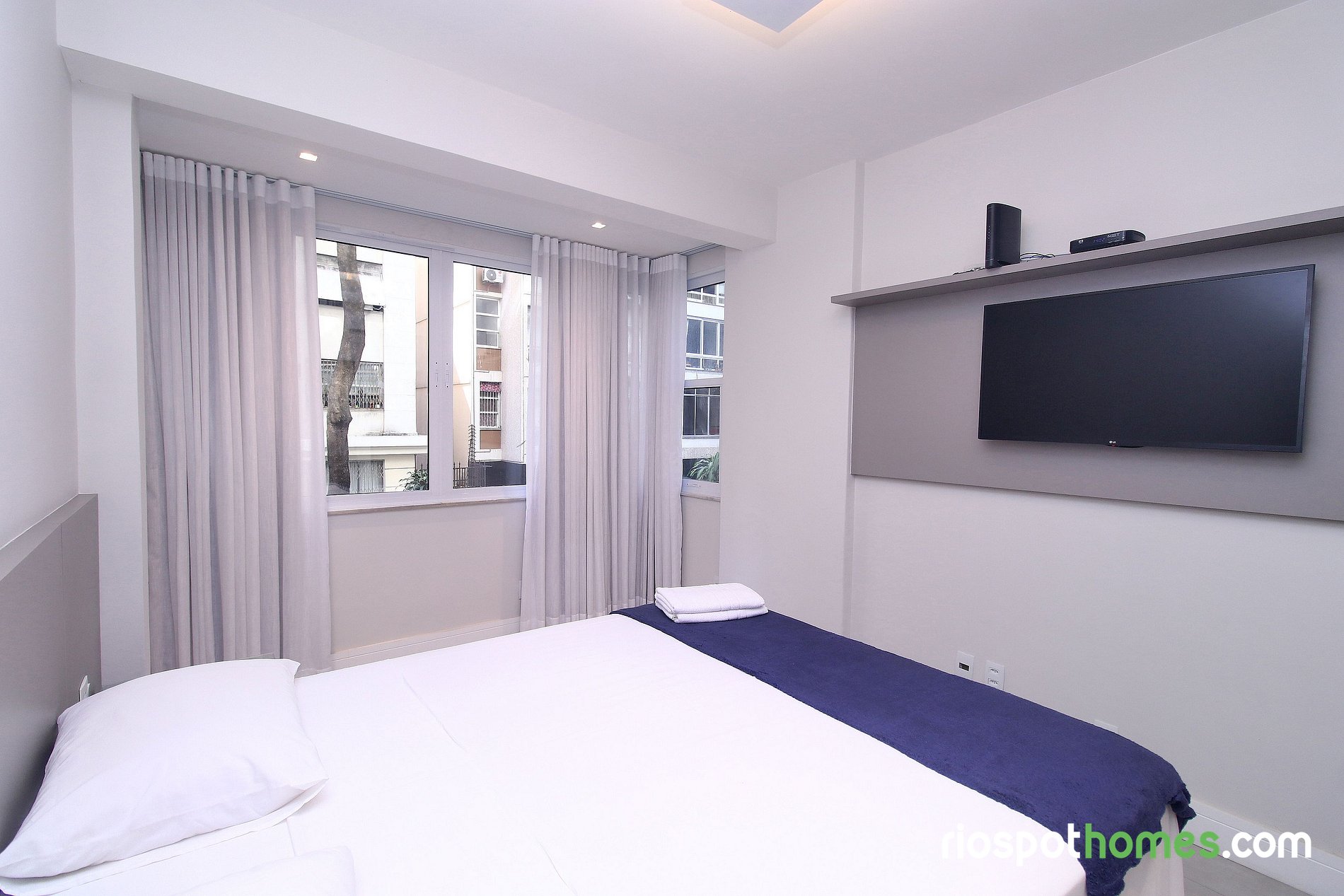 Quarto 1 com 1 cama Queen size, Smart TV, guarda-roupa, armário e ar condicionado split.