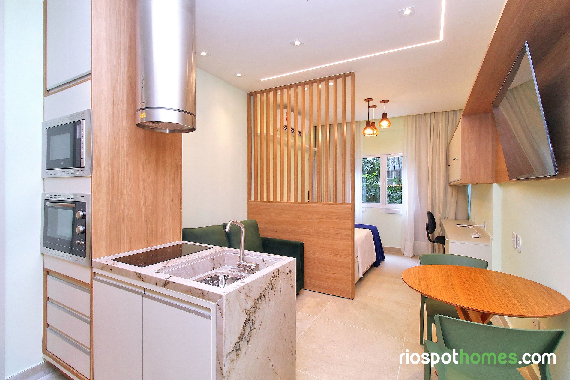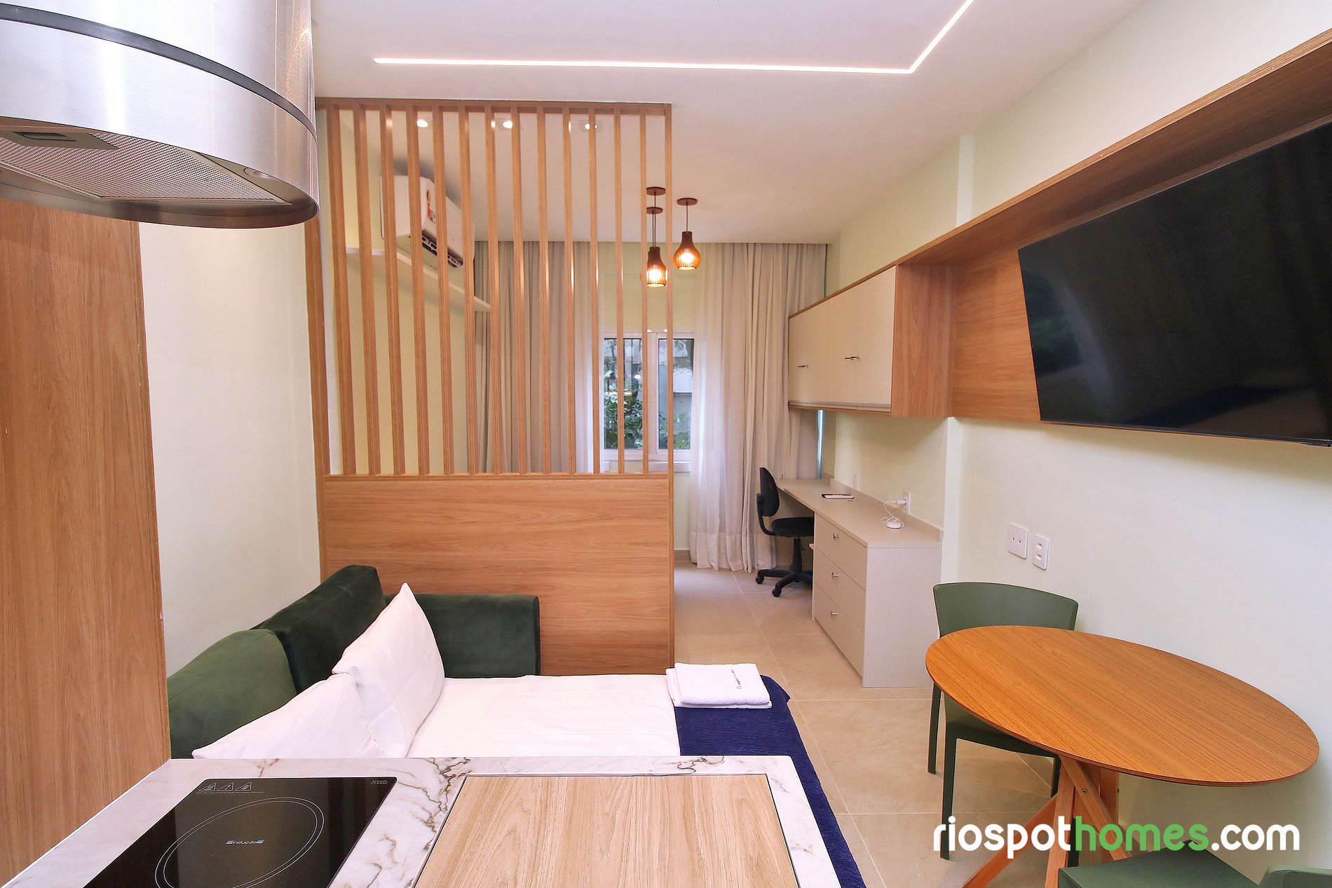 Studio de 28m2 dividido em quarto, cozinha e banheiro. Quarto com cama de casal confortável, sofá-cama de 2 lugares e cama de casal, SmartTV, guarda-roupa e ar condicionado. Cozinha completa composta com maquina de lavar e secar roupas, fogão cooktop eletrico com 2 bocas, forno, microondas, geladeira e utensílios básicos para cozinhar. Internet Wi-Fi incluído no preço.