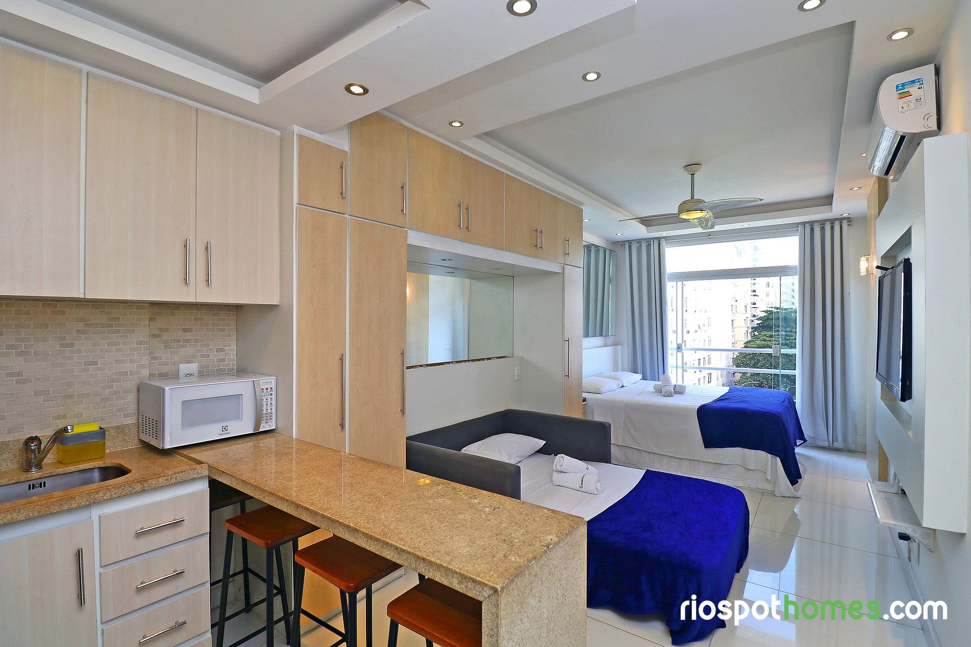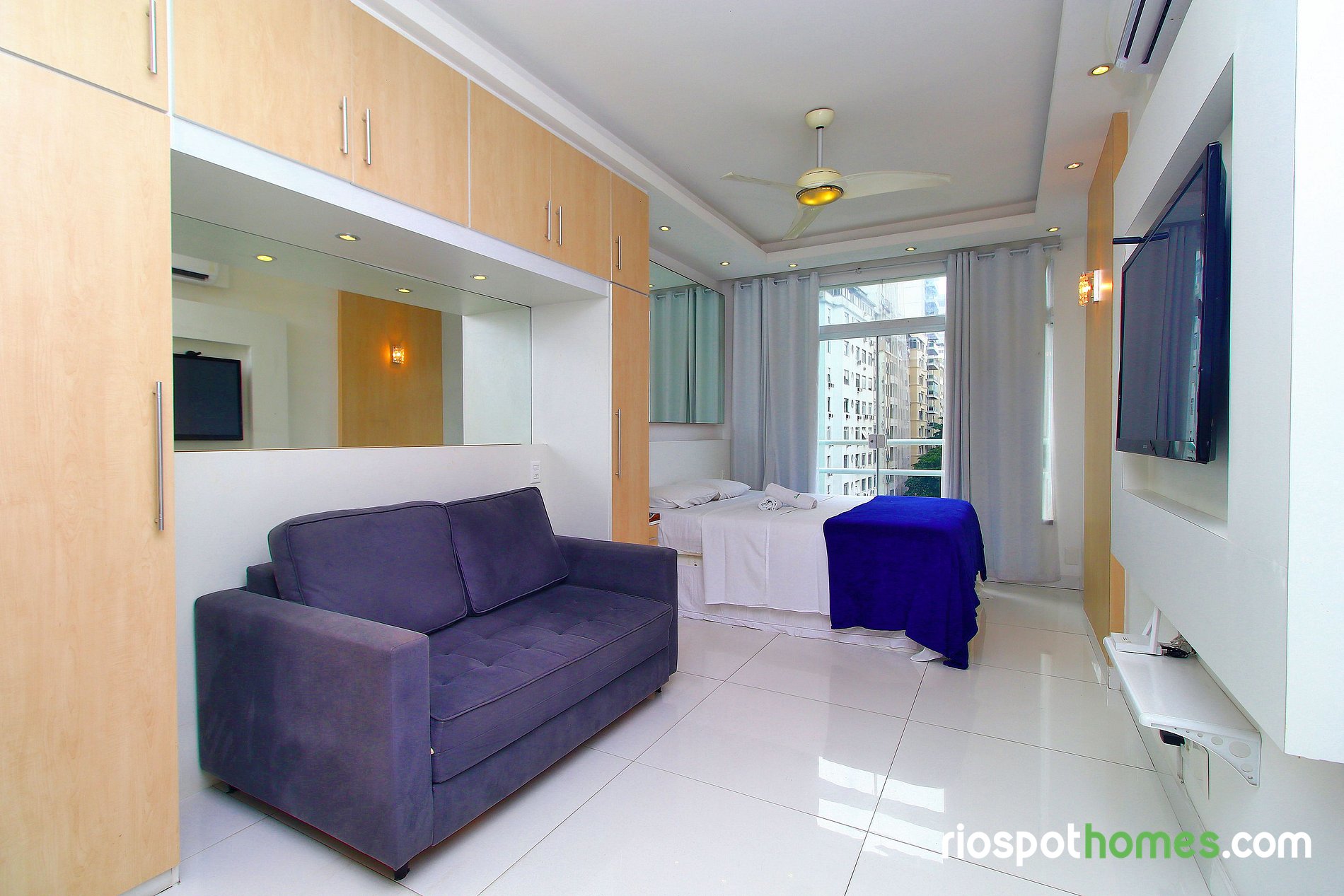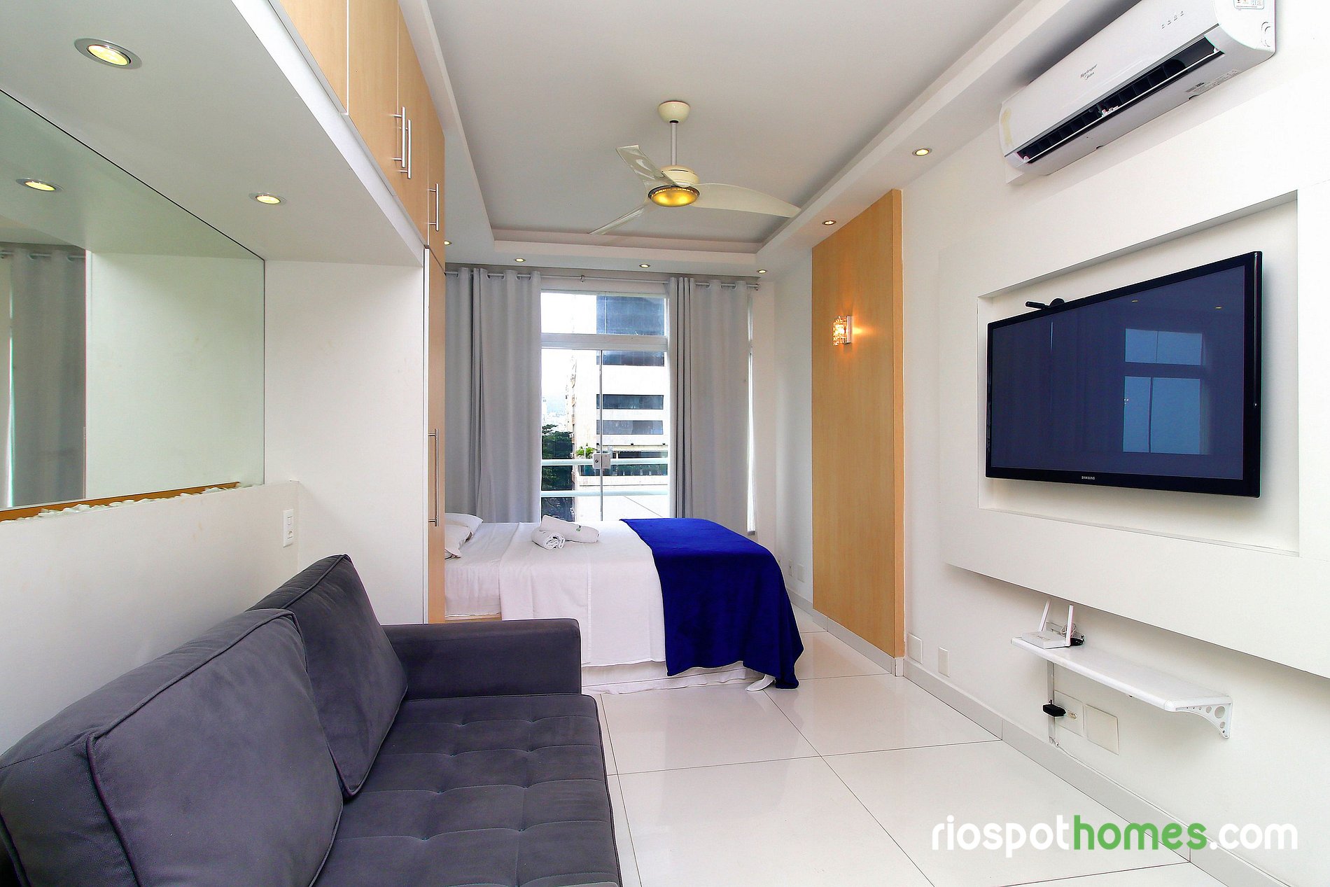 Além da vista panorâmica para o mar e para a praia de Copacabana, o imóvel tem teto rebaixado com iluminação indireta e diversos espelhos, garantindo assim uma hospedagem maravilhosamente agradável. Serviços adicionais, tais como Internet sem fio e TV , já estão inclusos no preço deste Copacabana apartamento para temporada Rio de Janeiro.