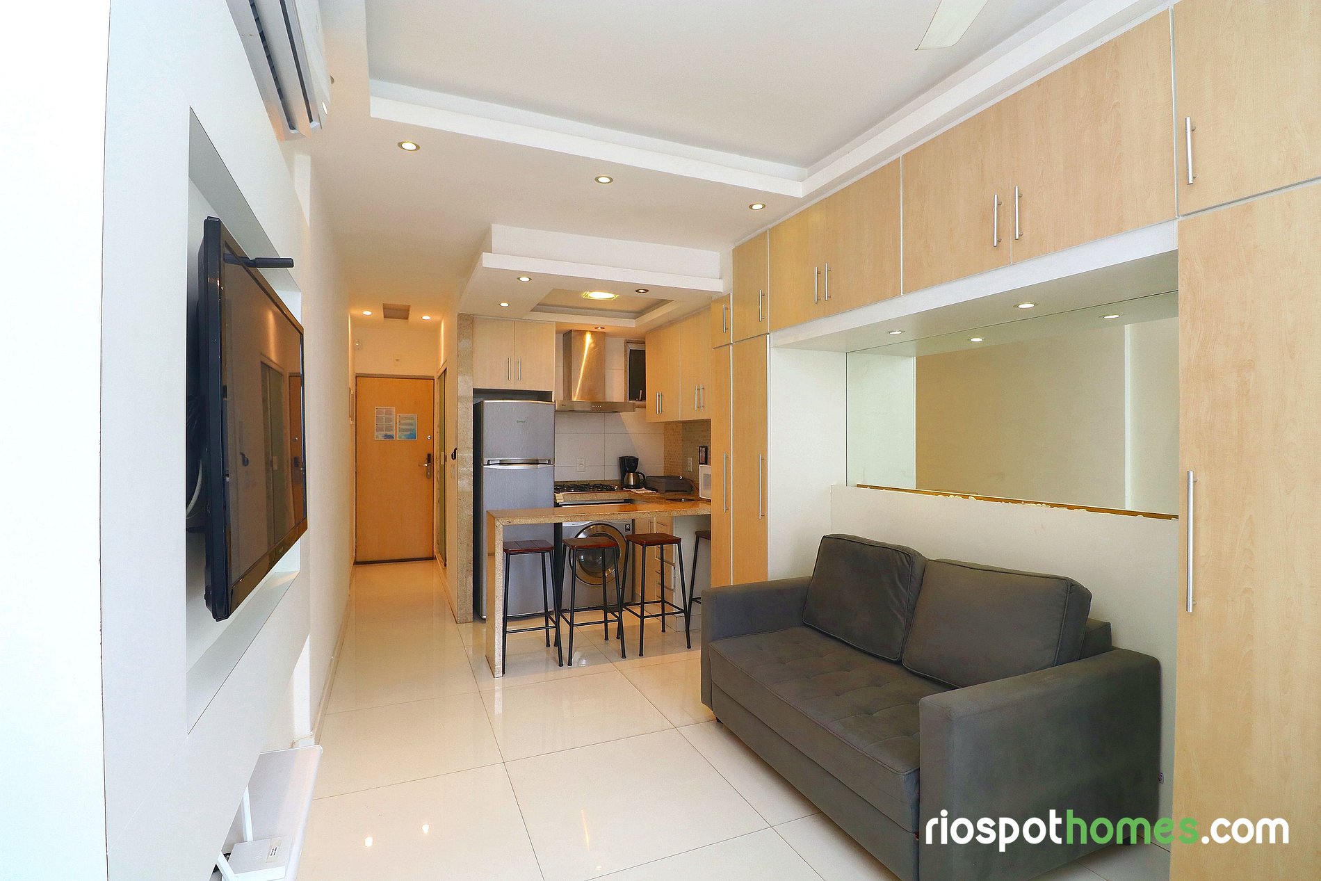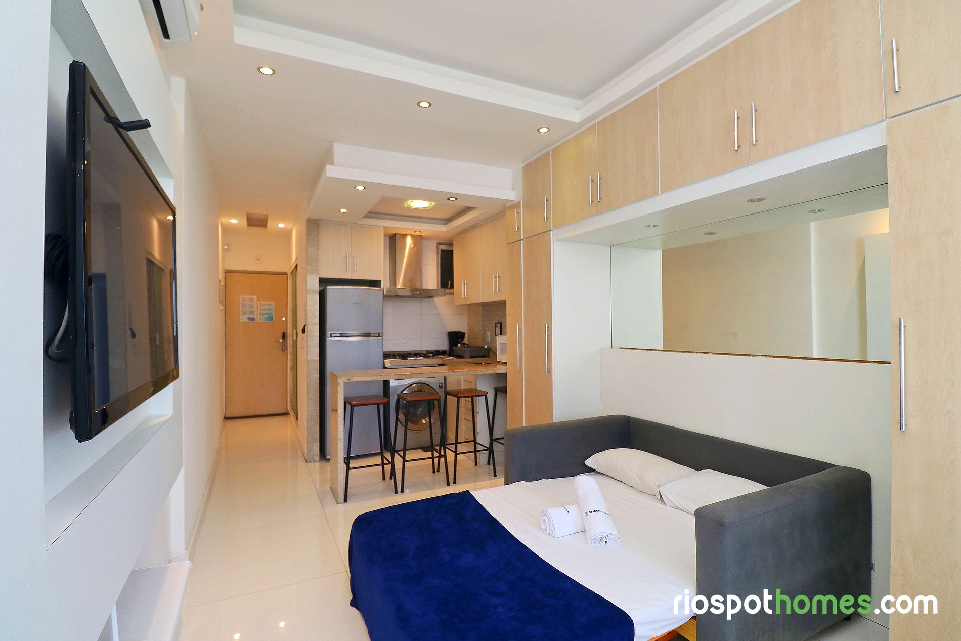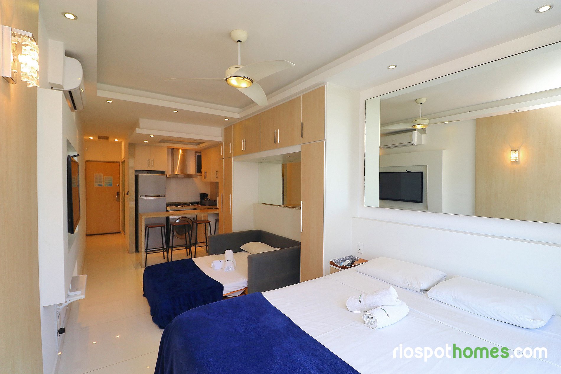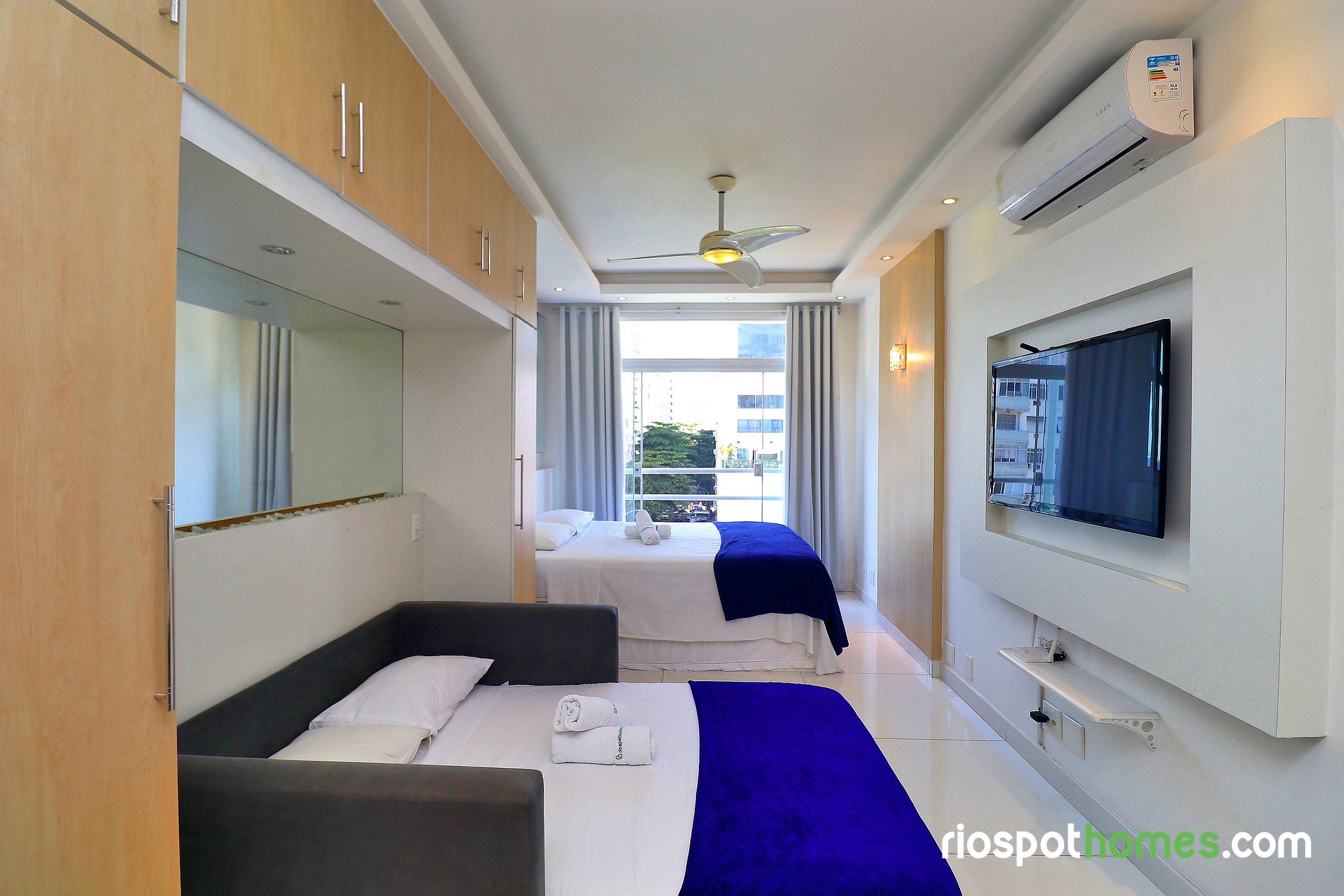 Além da vista panorâmica para o mar e para a praia de Copacabana, o imóvel tem teto rebaixado com iluminação indireta e diversos espelhos, garantindo assim uma hospedagem maravilhosamente agradável. Serviços adicionais, tais como Internet sem fio e TV , já estão inclusos no preço deste Copacabana apartamento para temporada Rio de Janeiro.