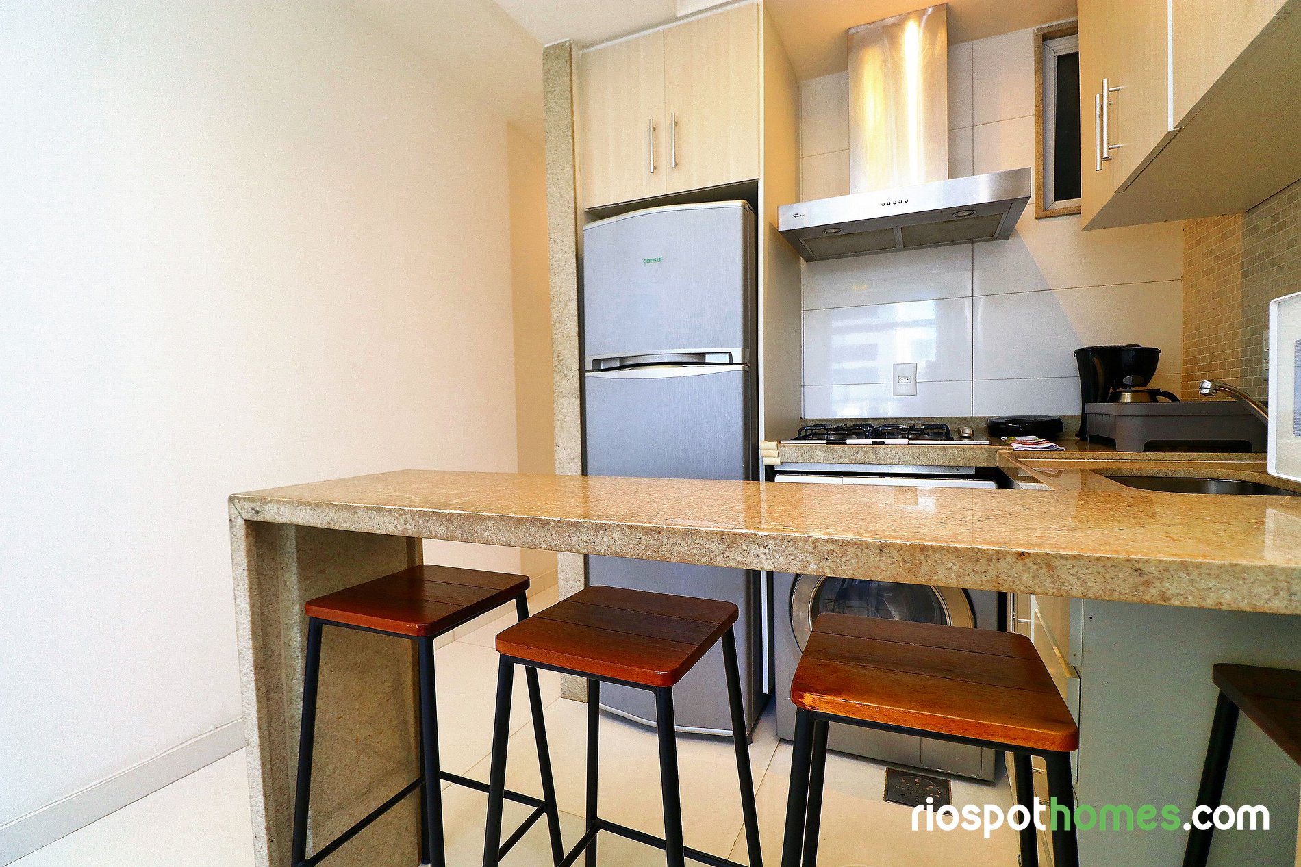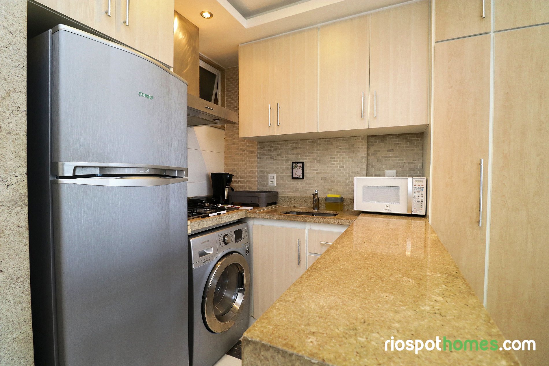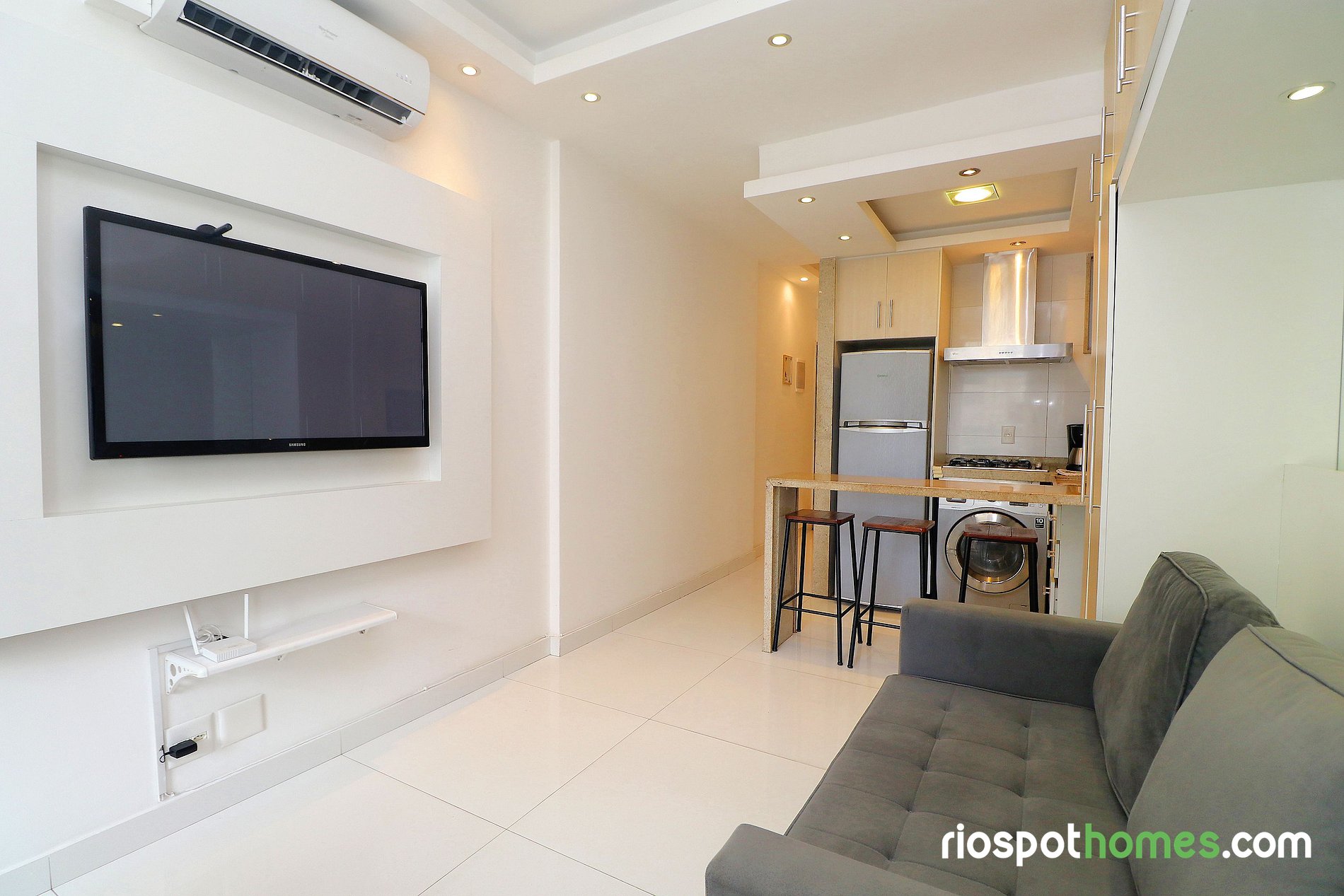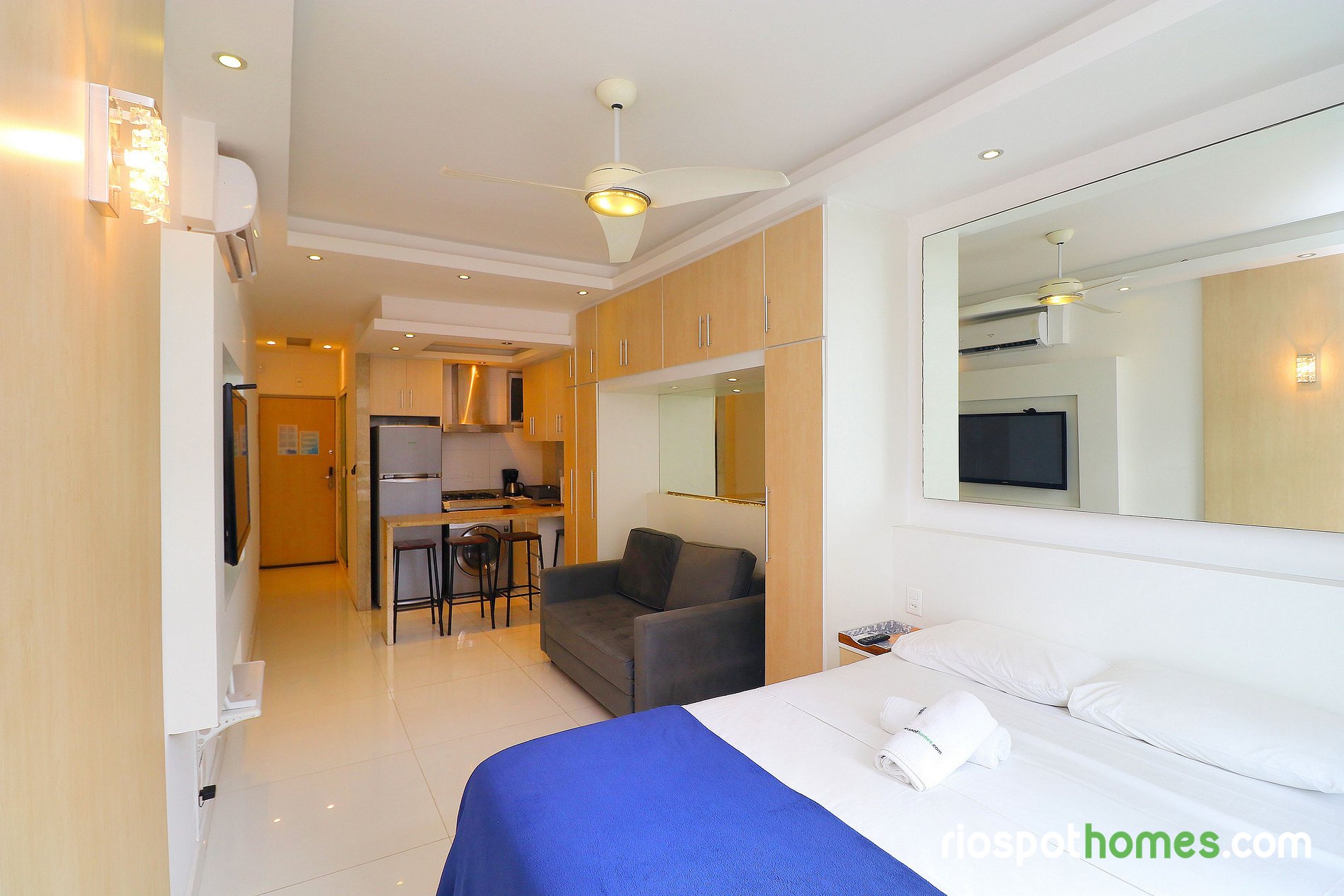 Este lindo apartamento para temporada tem uma área total de 32m² e está dividido em quarto, cozinha americana e banheiro. O quarto aconchegante possui uma cama de casal, sofá-cama, TV LCD, ar condicionado SPLIT, ventilador de teto e um guarda roupa embutido. A cozinha equipada com utensílios básicos, dispõe de uma máquina de lavar roupas, geladeira, micro-ondas, fogão cooktop de 4 bocas e cafeteira.