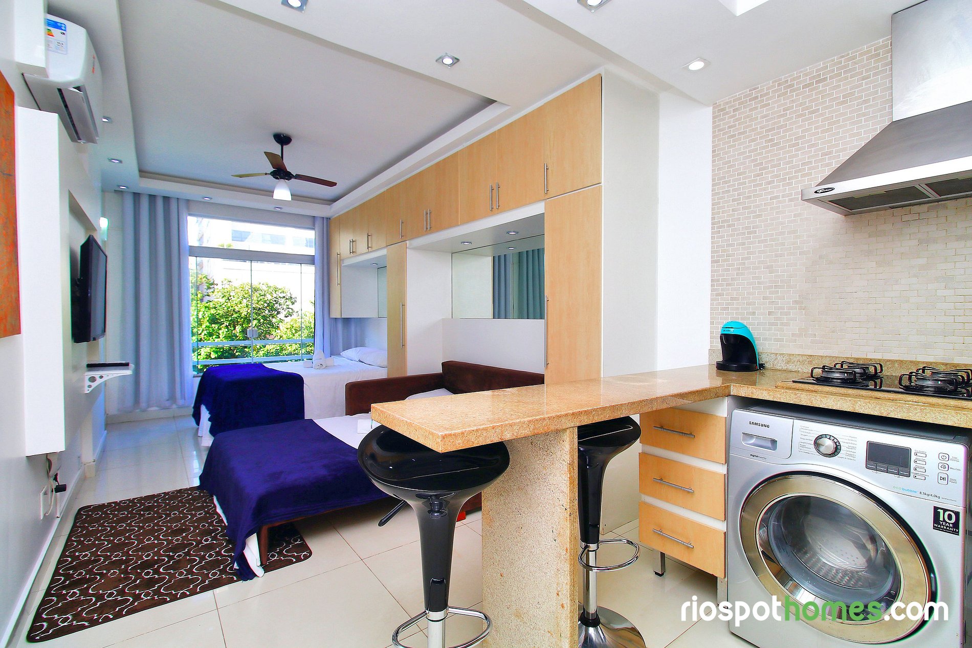 Este lindo apartamento para temporada tem uma área total de 32m² e está dividido em quarto, cozinha americana e banheiro. O quarto aconchegante possui uma cama de casal, sofá-cama, TV LCD, ar condicionado SPLIT, ventilador de teto e um guarda roupa embutido. A cozinha equipada com utensílios básicos, dispõe de uma máquina de lavar e secar, geladeira, microondas, fogão cooktop de 4 bocas e cafeteira.