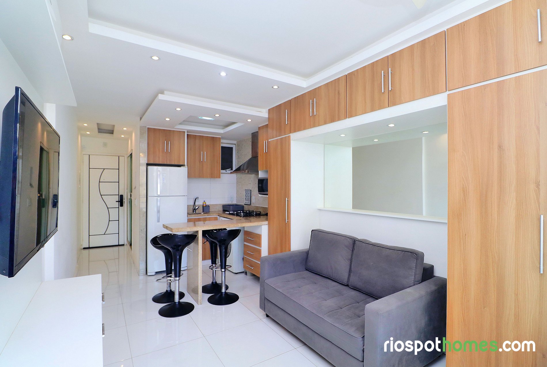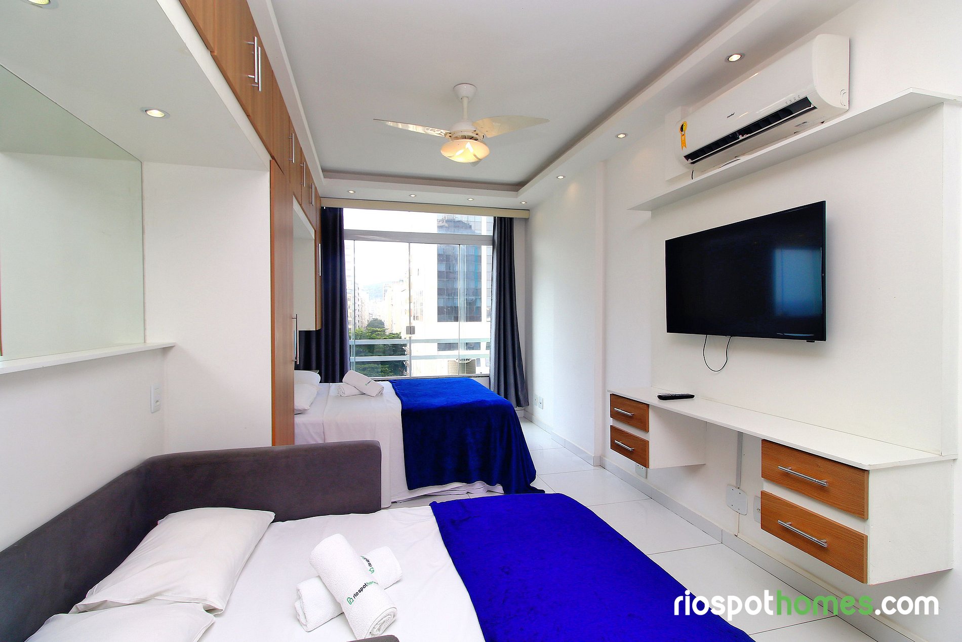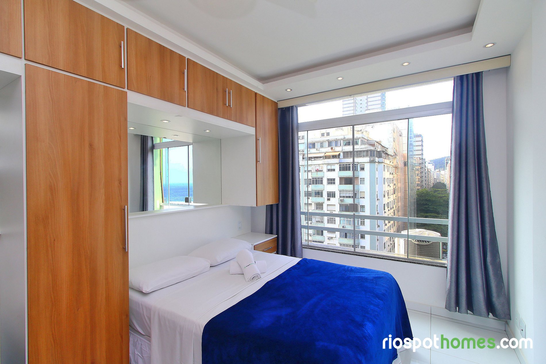 Além da vista panorâmica para o mar e para a praia de Copacabana, o imóvel tem teto rebaixado com iluminação indireta e diversos espelhos, garantindo assim uma hospedagem maravilhosamente agradável. Serviços adicionais, tais como Internet sem fio, esta incluso no preço deste Copacabana apartamento para temporada Rio de Janeiro.