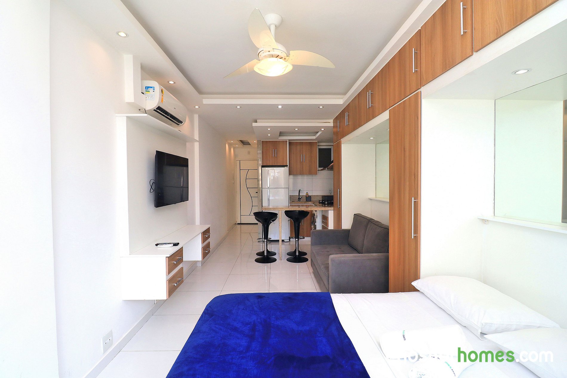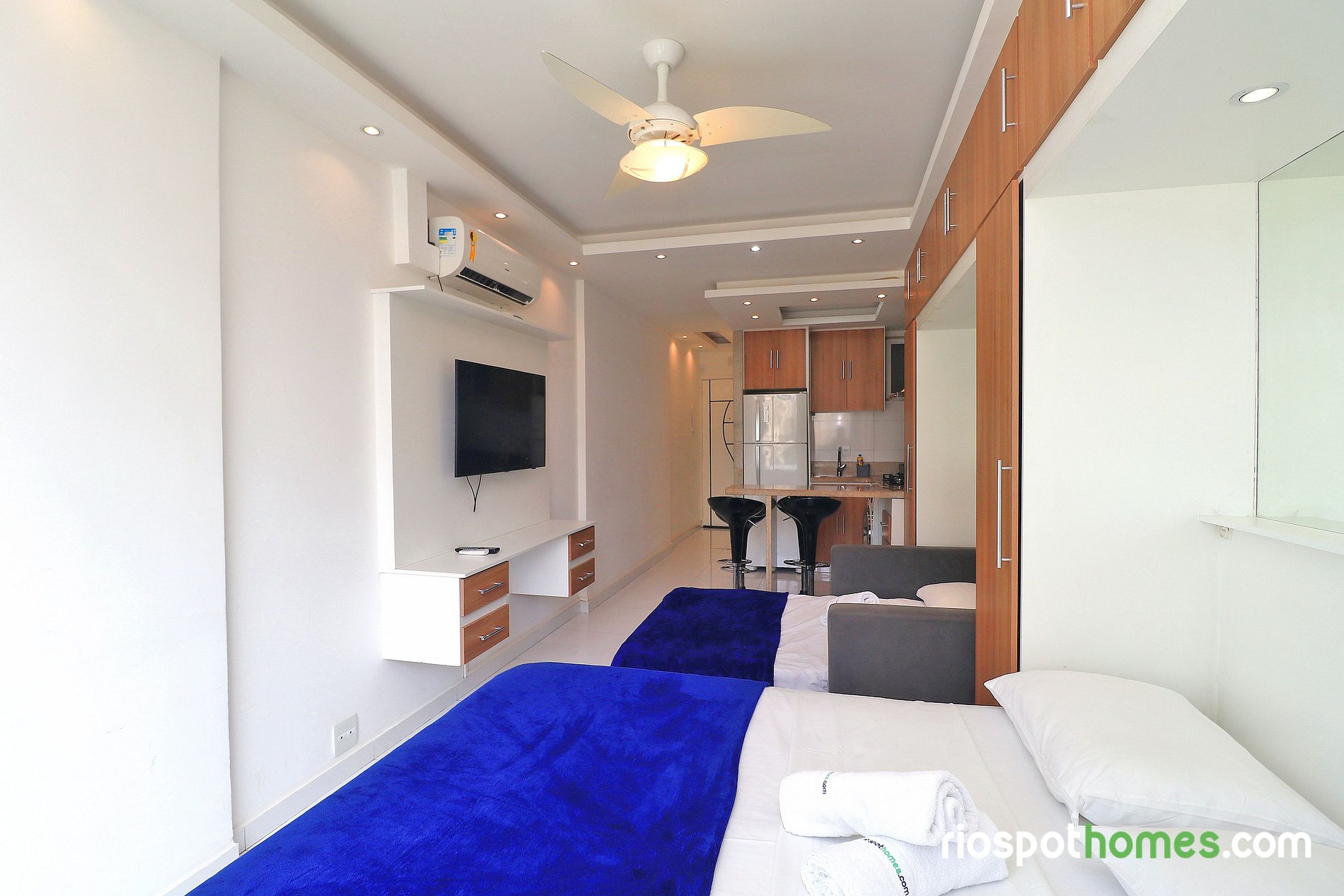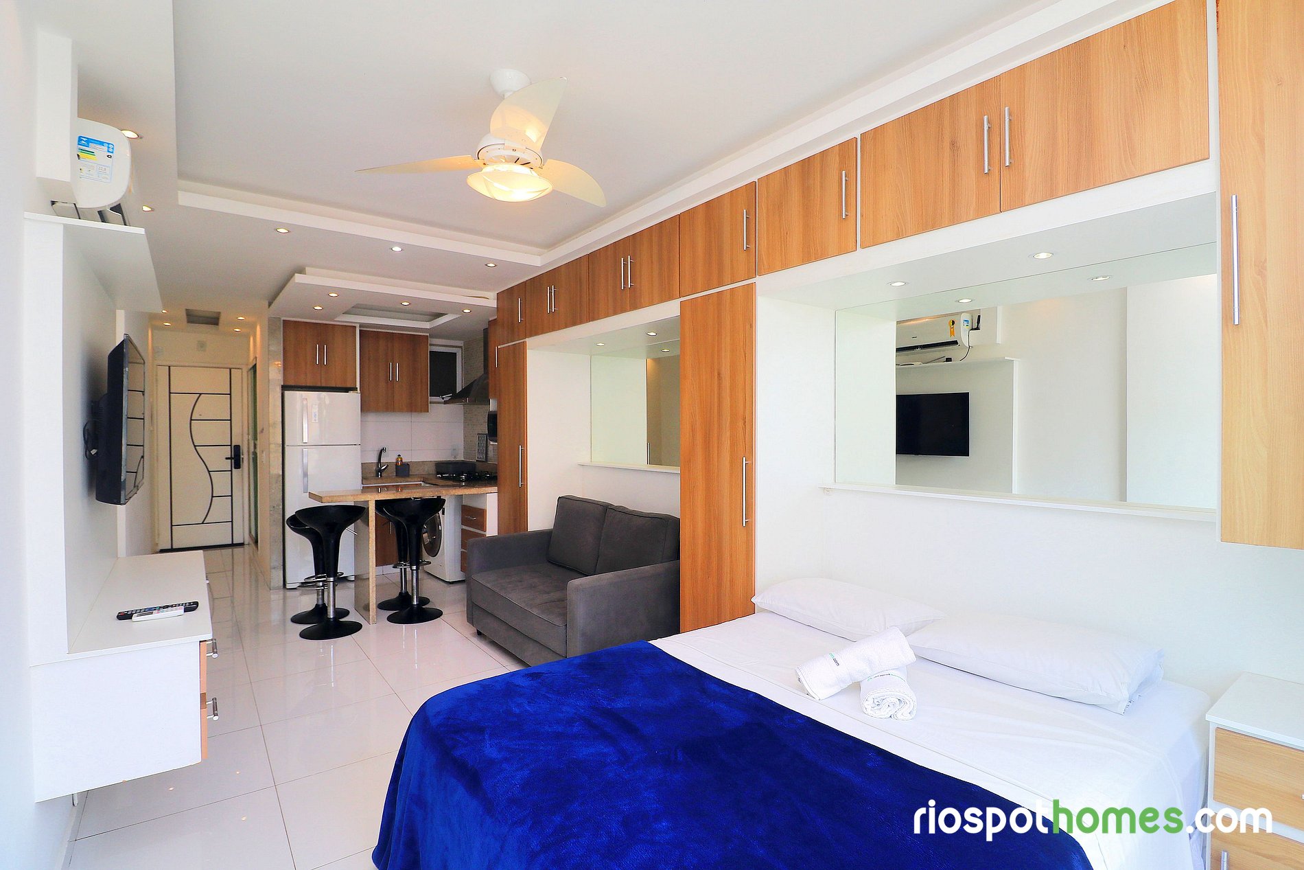 Este lindo apartamento para temporada tem uma área total de 32m² e está dividido em quarto, cozinha americana e banheiro. O quarto aconchegante possui uma cama de casal, sofá-cama, TV LCD, ar condicionado SPLIT, ventilador de teto e um guarda roupa embutido. A cozinha equipada com utensílios básicos, dispõe de uma máquina de lavar e secar, geladeira, microondas, fogão cooktop de 4 bocas e cafeteira.